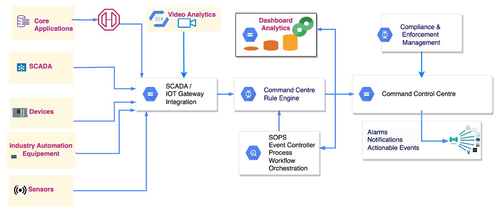 Enables Bi-directional communication between connected devices and controllers to evaluate events, identify patterns, drive workflow, and automate the critical and complex business operations.