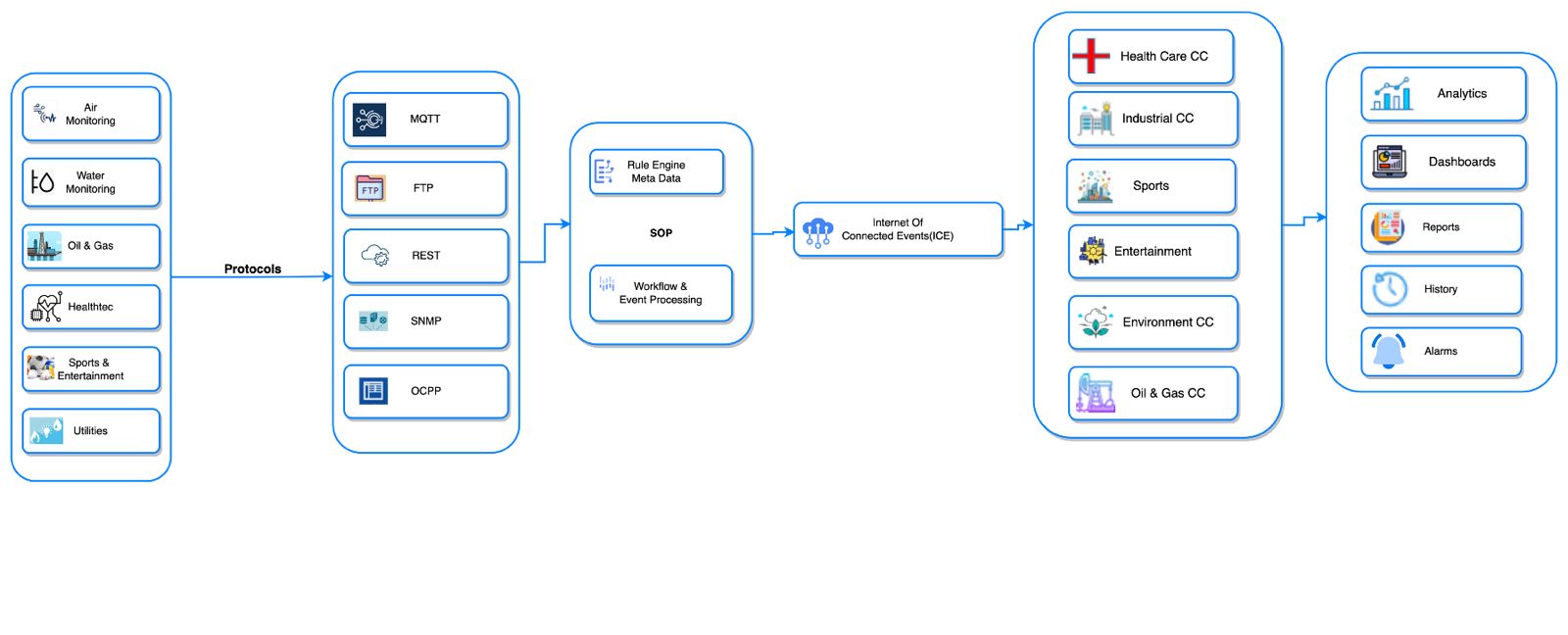 Smart ICE serves as the centrally managed digital nerve center, orchestrating intricate operations across diverse industry segments (managing complex processes across several industry sectors) such as Energy, Oil & Gas, Manufacturing, Utilities, Healthcare, Climate Tech, and Sports & Entertainment. Through intelligent automation, it generates alarms, alerts, and emergency notifications, delivering an unprecedented digital experience. Leveraging real-time automated event intelligence, Smart ICE monitors and controls business processes, telemetry, and IIoT devices, facilitating bi-directional events for enhanced control and optimization.